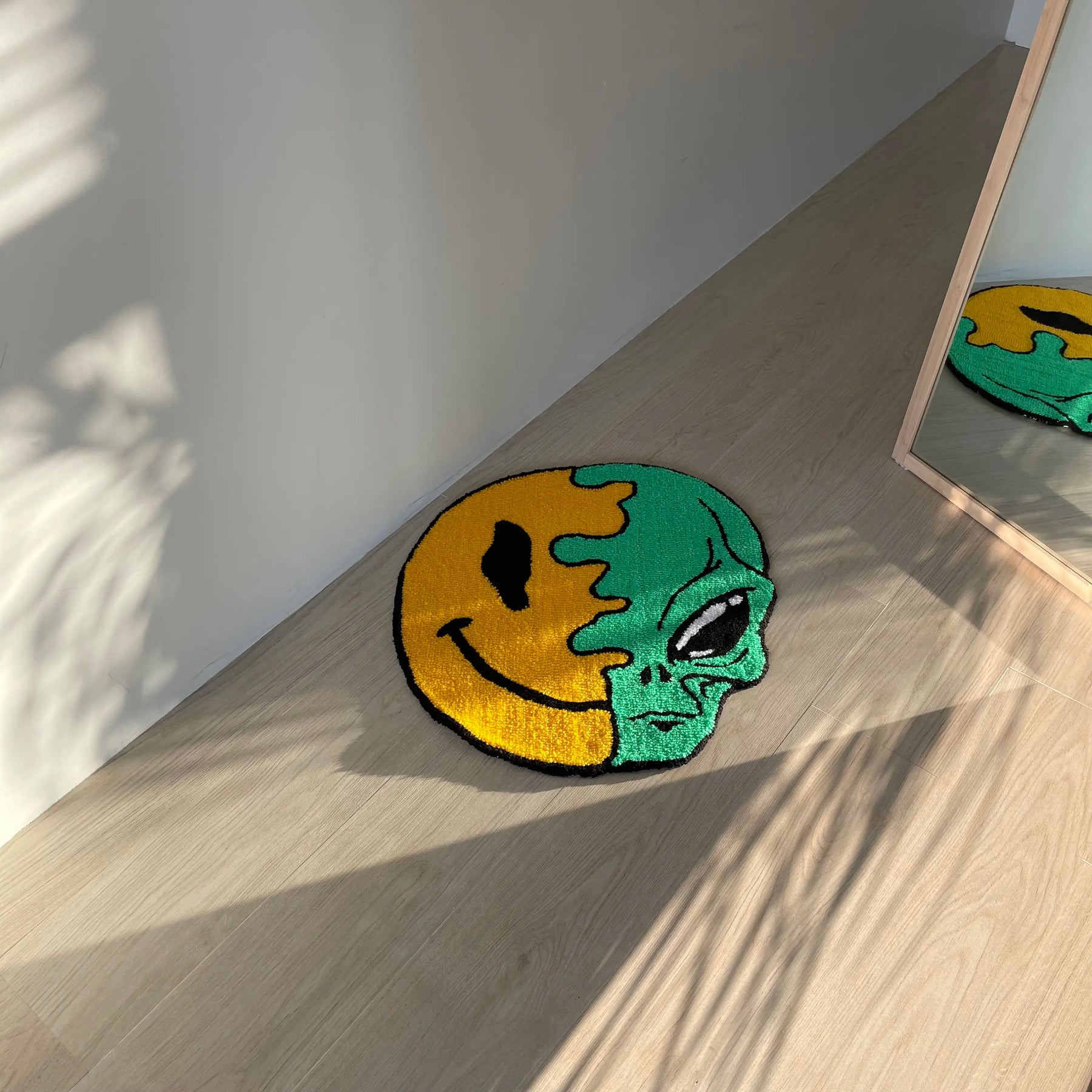 The 'Smileyverse' Carpet / Rug is a must-have for streetwear enthusiasts. Crafted from high-quality materials, it features a bold alien smiley graphic that adds a unique, eye-catching touch to any room. Soft and plush for comfort, it's available in two sizes (80x80 and 100x100), making it a perfect stylish upgrade for your space.
